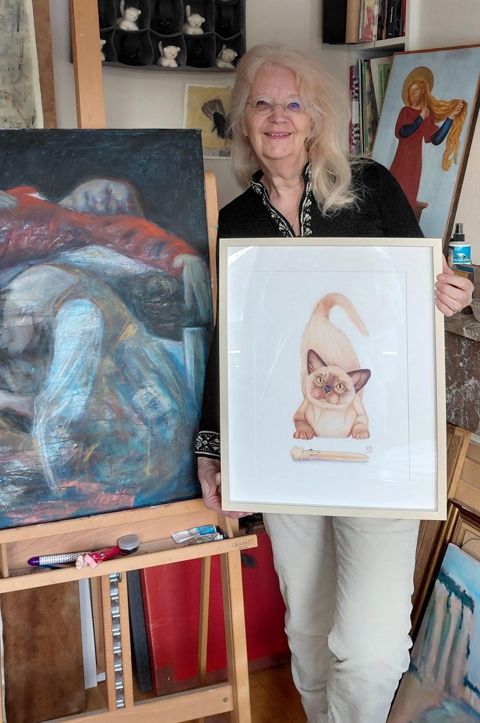 Houtskool, een van de oudste middelen om mee te tekenen, was jarenlang haar favoriete materiaal, helemaal toen er gekleurde houtskool op de markt kwam. Ook maakte ze schilderijen op basis van acrylverf, olieverf, aquarelverf en ei-tempera. “Een jaar of 5 geleden maakte ik voor het eerst en tekening met balpen”, zo vertelt Karin. “Ik raakte al snel in de ban van dit medium. Met voornamelijk blauwe en rode bic-pennen tekende ik van licht tot donker en alle nuances daar tussenin. Meer kleuren kreeg ik door verf of bic-pennen in zwart, blauw, rood, groen en pasteltinten toe te voegen. Maar voor portretten en huidtinten leenden deze zich niet goed. Totdat ik de tien-kleuren kinderpen uitprobeerde! Daarmee kan ik de juiste nuances aanbrengen”. Dit wordt voor Karin nog maar de derde expositie, want in exposeren is ze wat terughoudend. Dus maak nu van de gelegenheid gebruik en kom haar werken bewonderen.