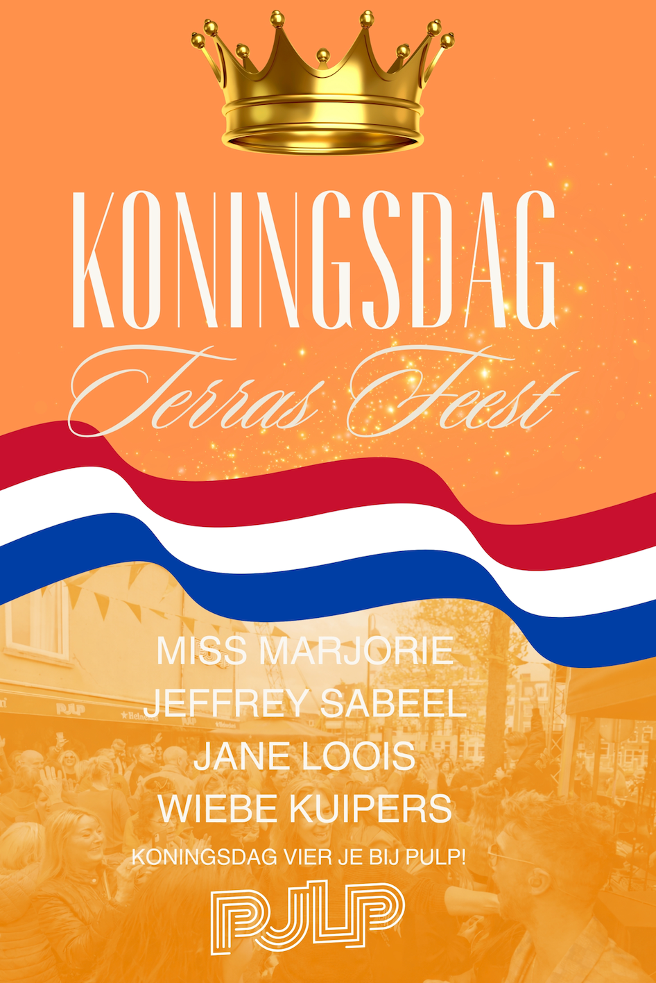 Op Koningsdag verandert het plein bij Café Pulp in één groot oranje feest. Van 12:00 tot 21:00 uur staat het terras volledig in het teken van live muziek, gezelligheid en samenzijn.